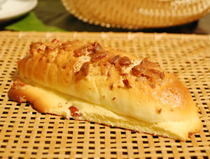 菓子パン生地にアーモンドの粒をちらばせて、その上にクッキー生地を乗せて焼き上げた、甘さ控えめの一品。ティータイムのお供にどうぞ。